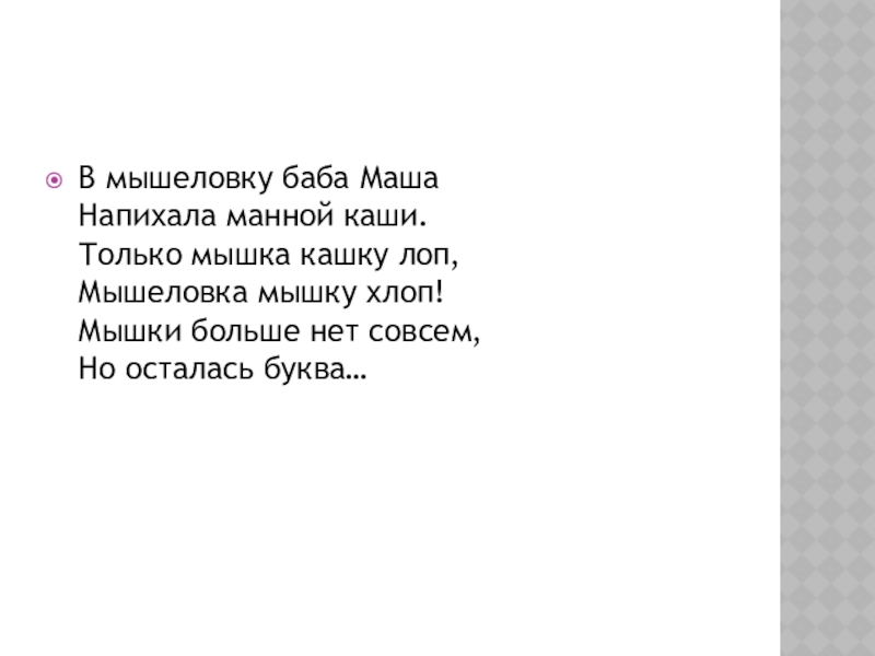 В мышеловку баба Маша Напихала манной каши. Только мышка кашку лоп, Мышеловка мышку хлоп! Мышки больше нет