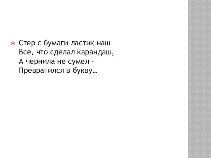Стер с бумаги ластик наш Все, что сделал карандаш, А чернила не сумел – Превратился в букву…