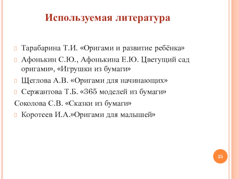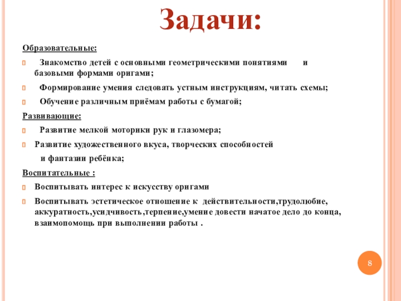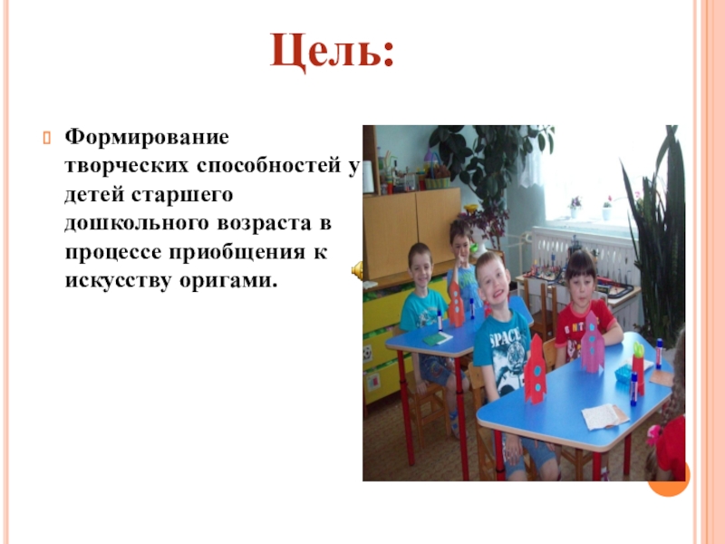 различных кружках домов творчества. Целью таких занятий является не складывание как можно большего количества разнообразных фигурок, а развитие у детей целого ряда способностей и навыков.