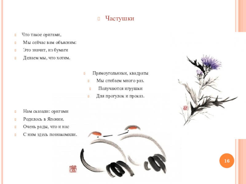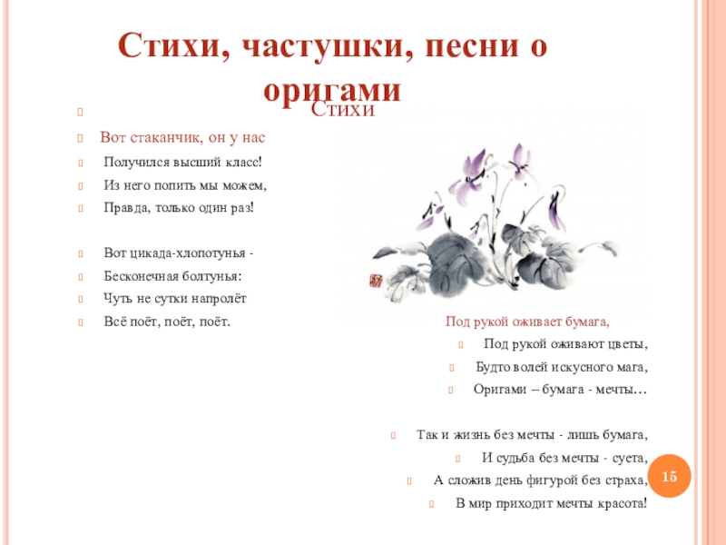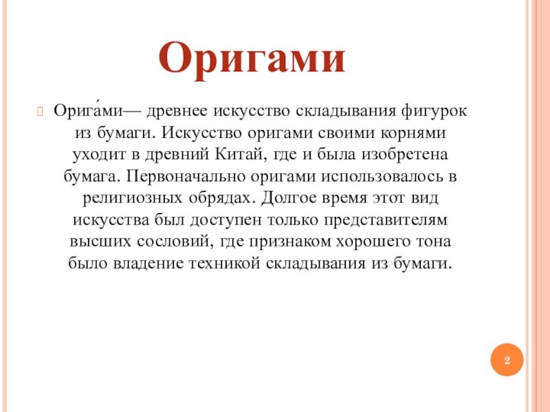 Орига́ми— древнее искусство складывания фигурок из бумаги. Искусство оригами своими корнями
