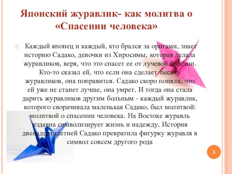 Слайд 3Японский журавлик- как молитва о «Спасении человека»