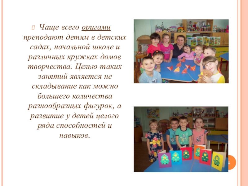 Слайд 4Чаще всего оригами преподают детям в детских садах, начальной школе и