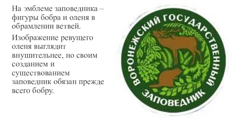 Слайд 3На эмблеме заповедника – фигуры бобра и оленя в обрамлении ветвей.