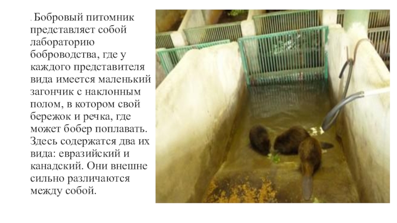 Слайд 6. Бобровый питомник представляет собой лабораторию боброводства, где у каждого представителя