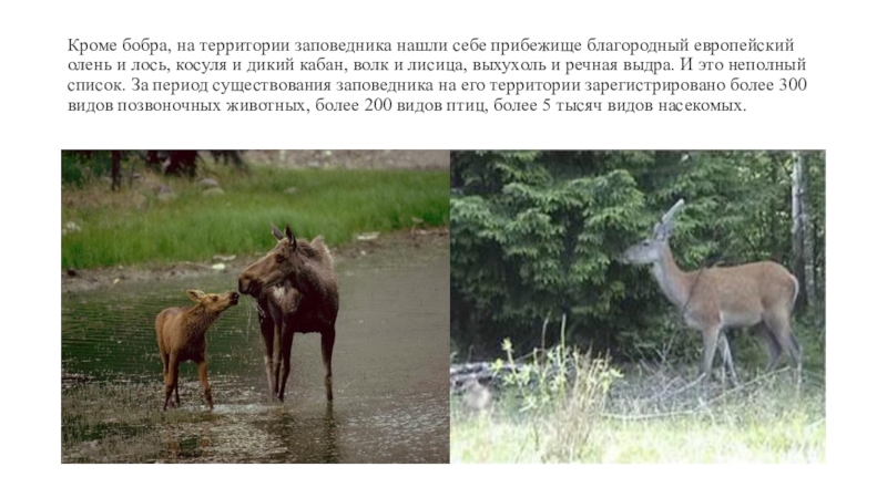Слайд 14Кроме бобра, на территории заповедника нашли себе прибежище благородный европейский олень и