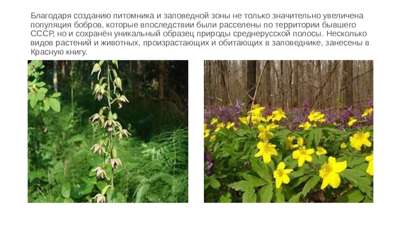 бобров, которые впоследствии были расселены по территории бывшего СССР, но и сохранён уникальный образец природы среднерусской полосы. Несколько видов растений и животных, произрастающих и обитающих в заповеднике, занесены в Красную книгу.