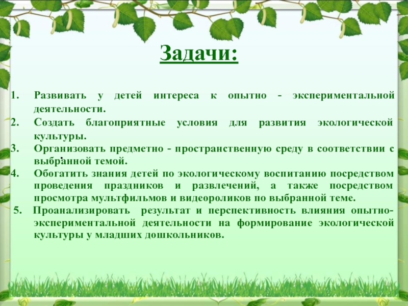 Обогатить знания детей по экологическому воспитанию посредством проведения праздников и развлечений, а также посредством просмотра мультфильмов и видеороликов по выбранной теме.