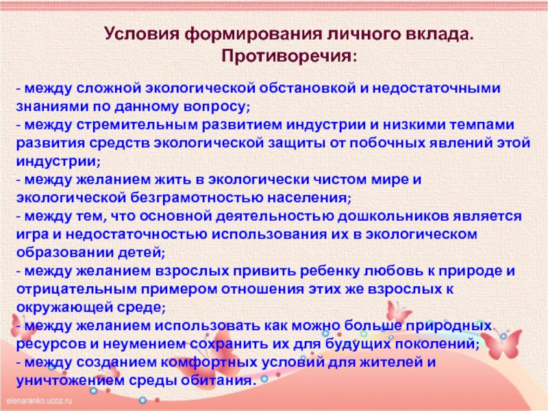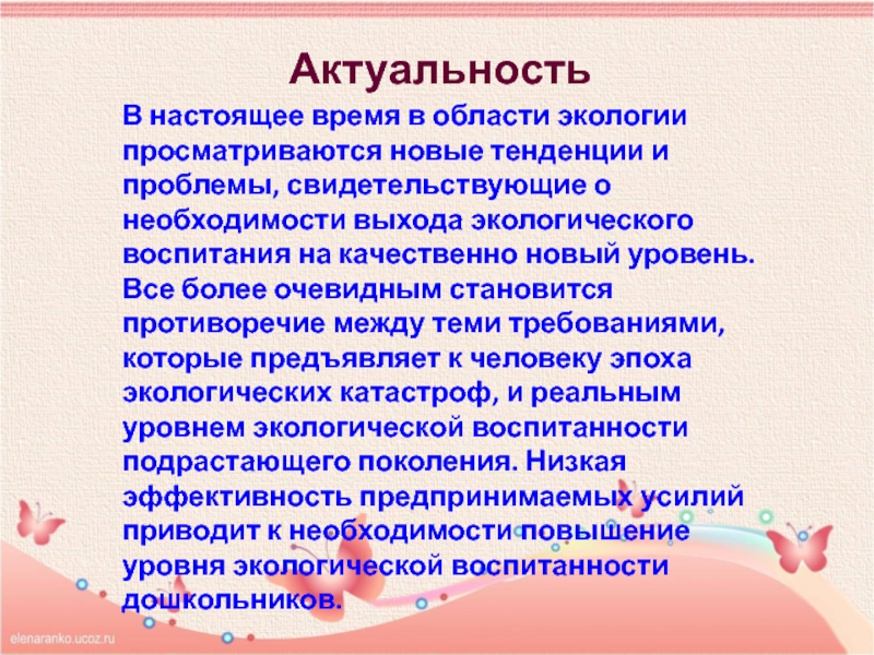 свидетельствующие о необходимости выхода экологического воспитания на качественно новый уровень. Все более очевидным становится противоречие между теми требованиями, которые предъявляет к человеку эпоха экологических катастроф, и реальным уровнем экологической воспитанности подрастающего поколения. Низкая эффективность предпринимаемых усилий приводит к необходимости повышение уровня экологической воспитанности дошкольников.