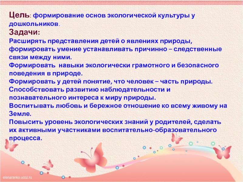 Слайд 5Цель: формирование основ экологической культуры у дошкольников.