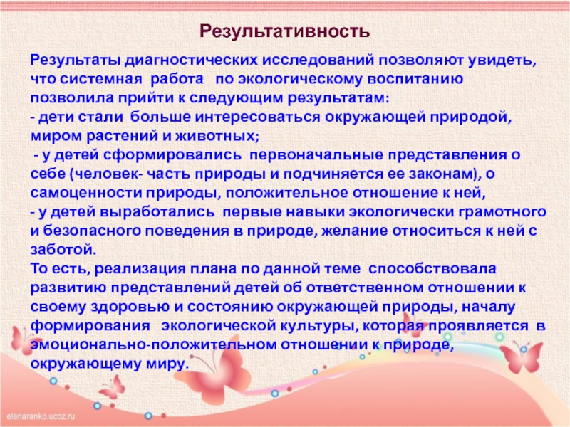 То есть, реализация плана по данной теме способствовала развитию представлений детей об ответственном отношении к своему здоровью и состоянию окружающей природы, началу формирования экологической культуры, которая проявляется в эмоционально-положительном отношении к природе, окружающему миру.