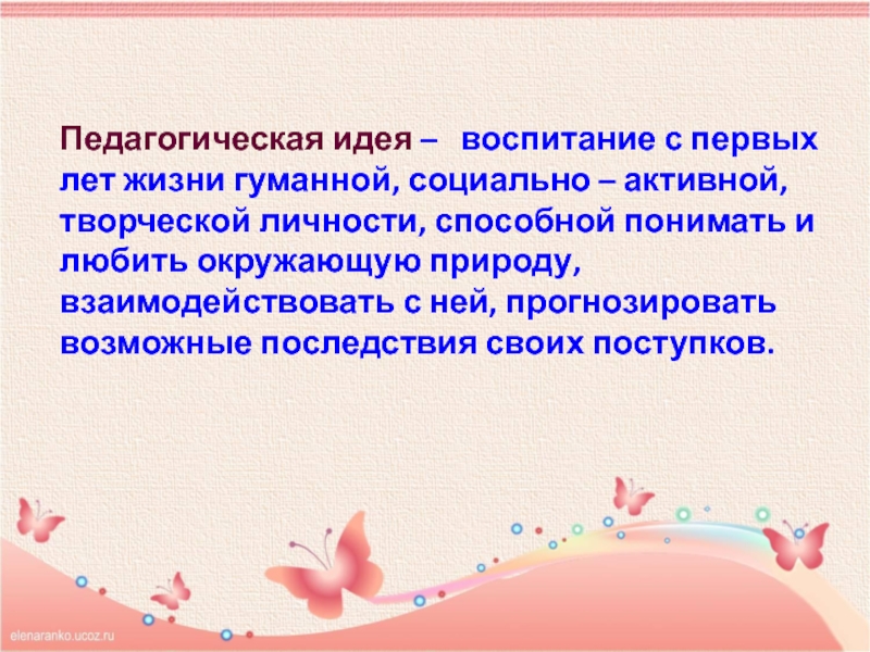 Слайд 7Педагогическая идея – воспитание с первых лет жизни гуманной, социально