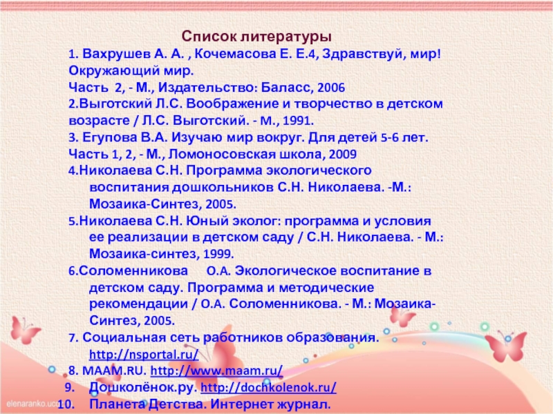 4.Николаева С.Н. Программа экологического воспитания дошкольников С.Н. Николаева. -М.: Мозаика-Синтез, 2005.