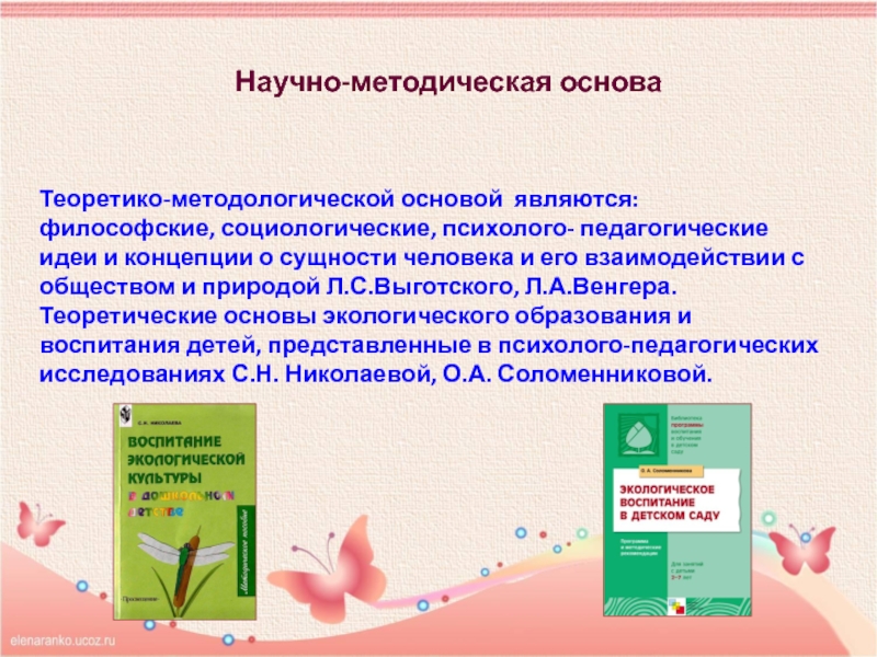 Теоретические основы экологического образования и воспитания детей, представленные в психолого-педагогических исследованиях С.Н. Николаевой, О.А. Соломенниковой.