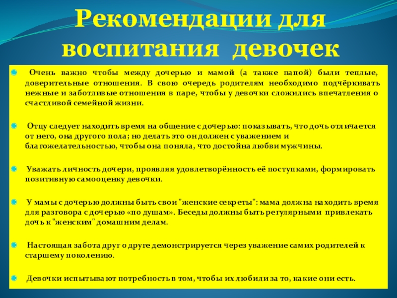 Рекомендации для воспитания девочек Очень важно чтобы между дочерью и мамой (а также папой)