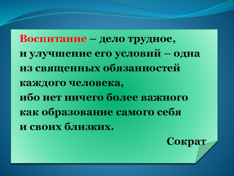 Воспитание – дело трудное, и улучшение его условий – одна из священных обязанностей каждого человека, ибо