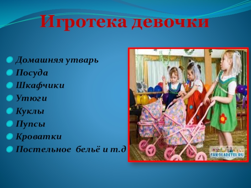 Игротека девочки   Домашняя утварьПосудаШкафчикиУтюгиКуклыПупсыКроваткиПостельное бельё и т.д