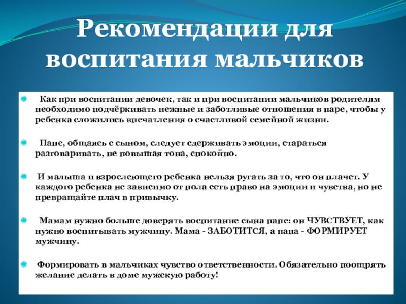 Рекомендации для воспитания мальчиков Как при воспитании девочек, так и при воспитании мальчиков родителям необходимо подчёркивать нежные