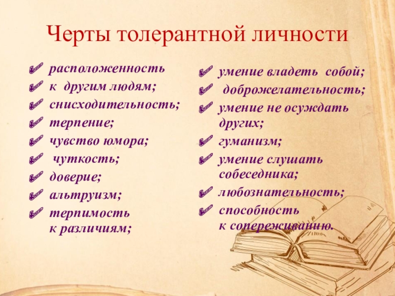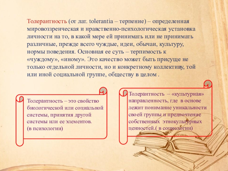 Толерантность – это свойство биологической или социальной системы, принятия другой системы или ее элементов.