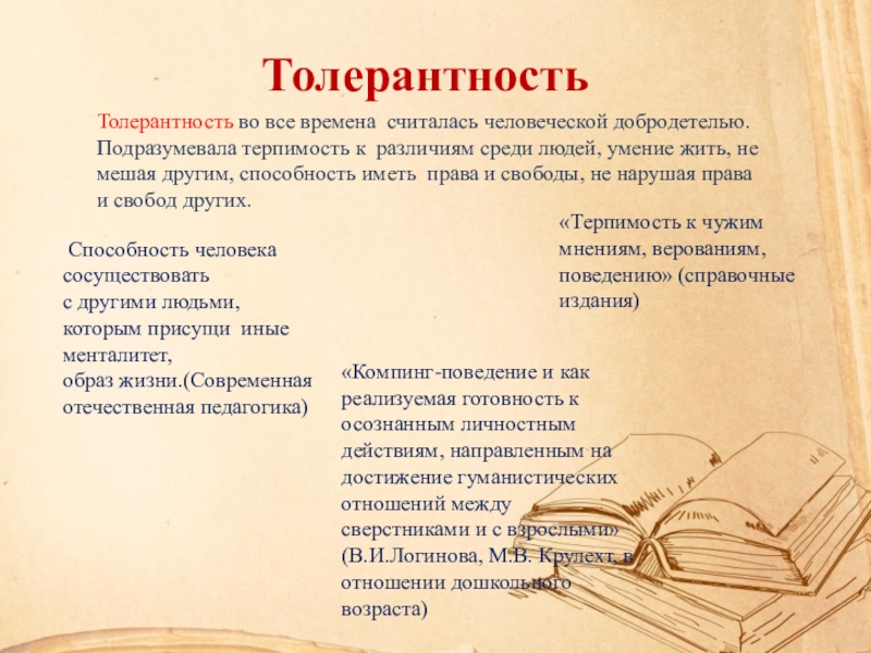 Способность человека сосуществовать с другими людьми, которым присущи иные менталитет, образ жизни.(Современная отечественная педагогика)