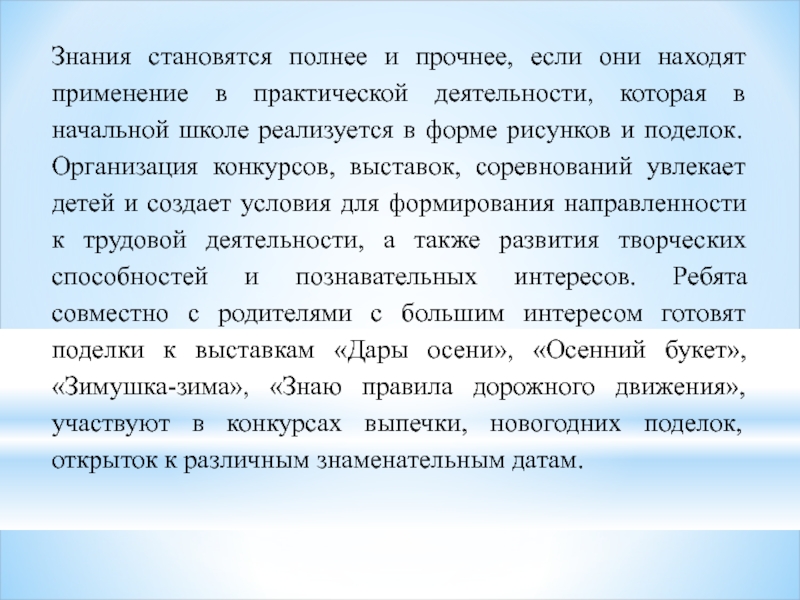 деятельности, которая в начальной школе реализуется в форме рисунков и поделок. Организация конкурсов, выставок, соревнований увлекает детей и создает условия для формирования направленности к трудовой деятельности, а также развития творческих способностей и познавательных интересов. Ребята совместно с родителями с большим интересом готовят поделки к выставкам «Дары осени», «Осенний букет», «Зимушка-зима», «Знаю правила дорожного движения», участвуют в конкурсах выпечки, новогодних поделок, открыток к различным знаменательным датам.