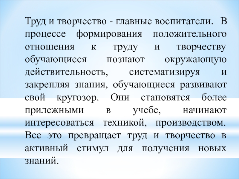 к труду и творчеству обучающиеся познают окружающую действительность, систематизируя и закрепляя знания, обучающиеся развивают свой кругозор. Они становятся более прилежными в учебе, начинают интересоваться техникой, производством. Все это превращает труд и творчество в активный стимул для получения новых знаний.