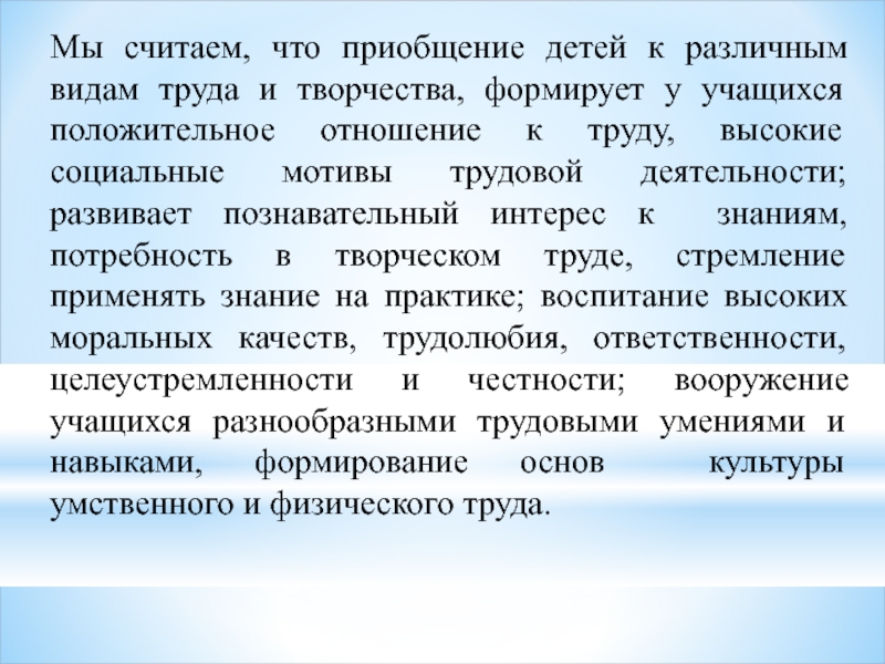 Слайд 26Мы считаем, что приобщение детей к различным видам труда и творчества,