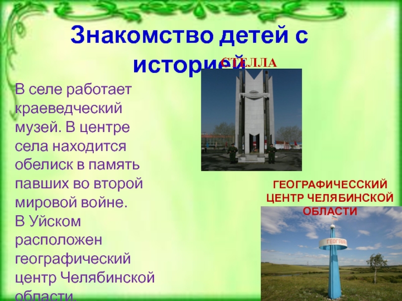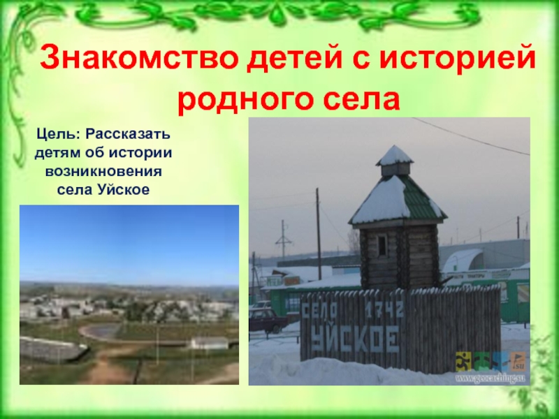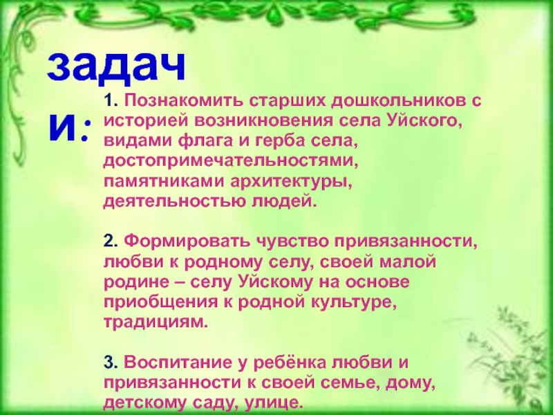2. Формировать чувство привязанности, любви к родному селу, своей малой родине – селу Уйскому на основе приобщения к родной культуре, традициям.