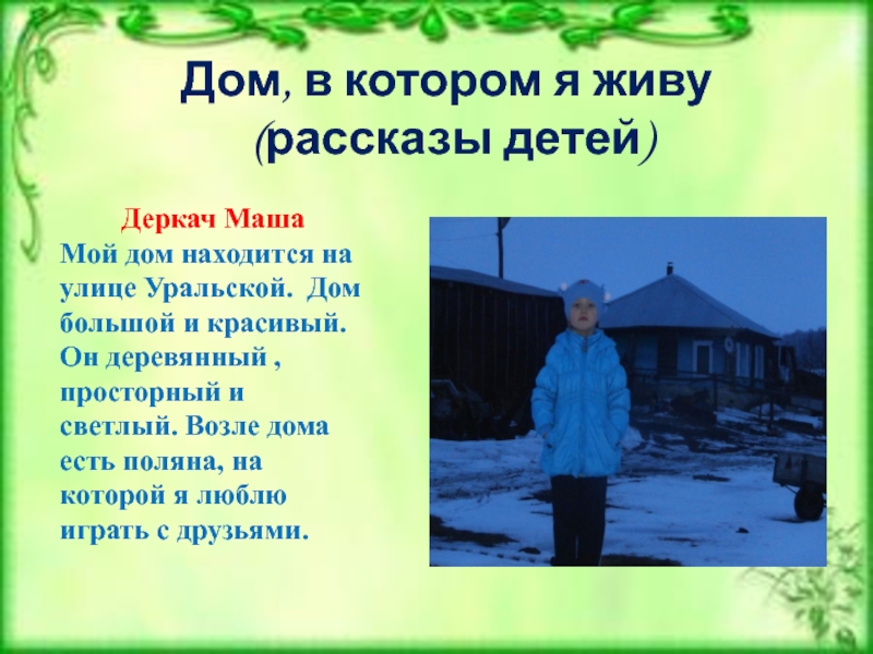 на улице Уральской. Дом большой и красивый. Он деревянный , просторный и светлый. Возле дома есть поляна, на которой я люблю играть с друзьями.