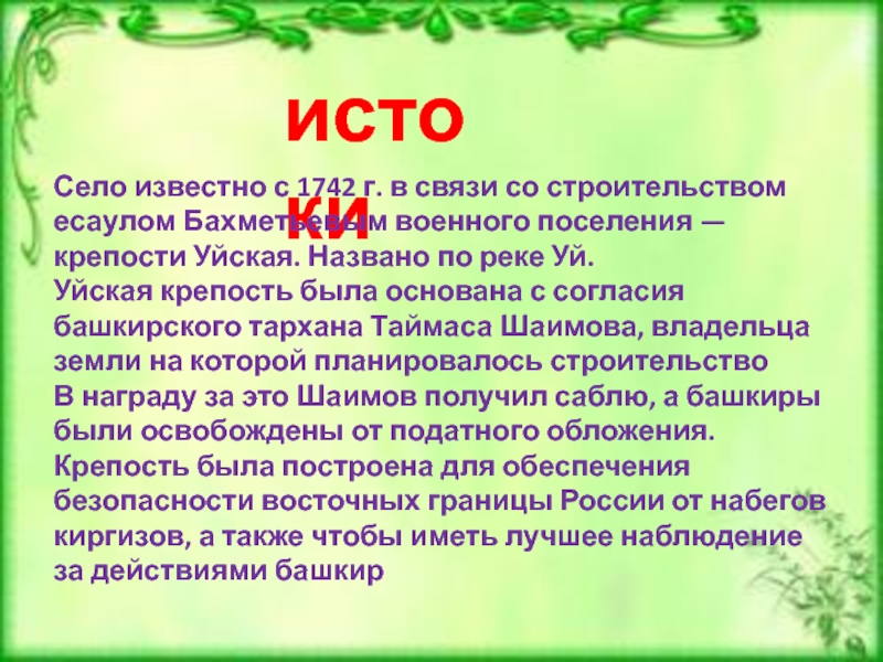Уйская крепость была основана с согласия башкирского тархана Таймаса Шаимова, владельца земли на которой планировалось строительство