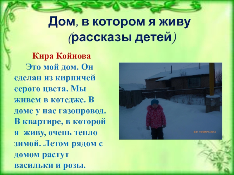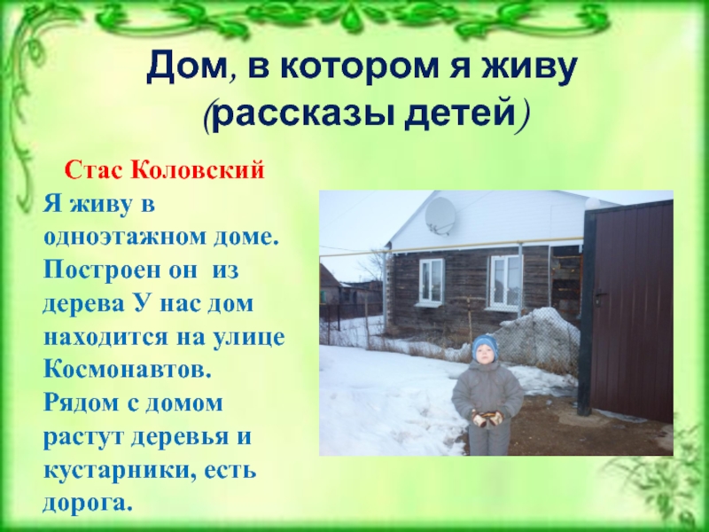 Построен он из дерева У нас дом находится на улице Космонавтов. Рядом с домом растут деревья и кустарники, есть дорога.