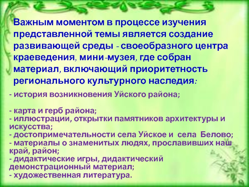 Слайд 8Важным моментом в процессе изучения представленной темы является создание развивающей среды
