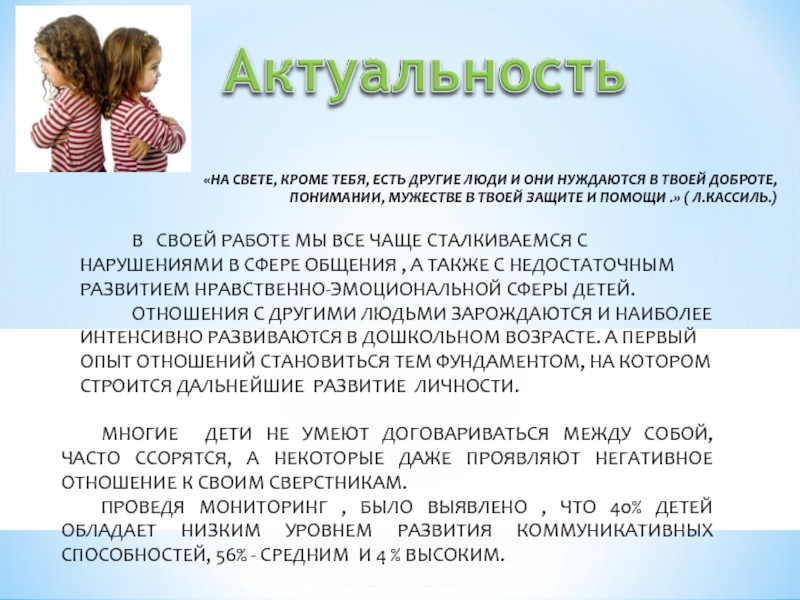 В СВОЕЙ РАБОТЕ МЫ ВСЕ ЧАЩЕ СТАЛКИВАЕМСЯ С НАРУШЕНИЯМИ В СФЕРЕ ОБЩЕНИЯ , А ТАКЖЕ С НЕДОСТАТОЧНЫМ РАЗВИТИЕМ НРАВСТВЕННО-ЭМОЦИОНАЛЬНОЙ СФЕРЫ ДЕТЕЙ.