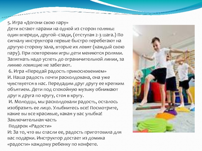 Ходьба по выложенной дорожке (ширина50см, плотно лицом друг к другу, держась за руки, боковым приставным шагом. Далее, препятствие-конусы (камни) пройти их, держась за руки, растянуться, руки образуют воротики.
