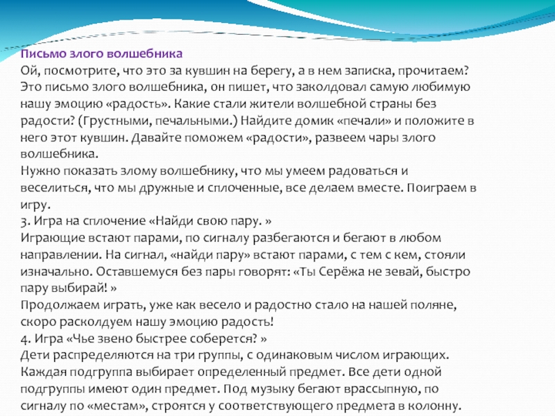Приехал поезд! Ребята, скажите, что вы чувствуете? (Радость, веселье.) Вот здорово! Найдите домик «радости» в волшебной стране и подарите ей рельсы от своего поезда. (Дети собирают гимнастические палки и кладут в корзинку, на котором изображен радостный смайлик).