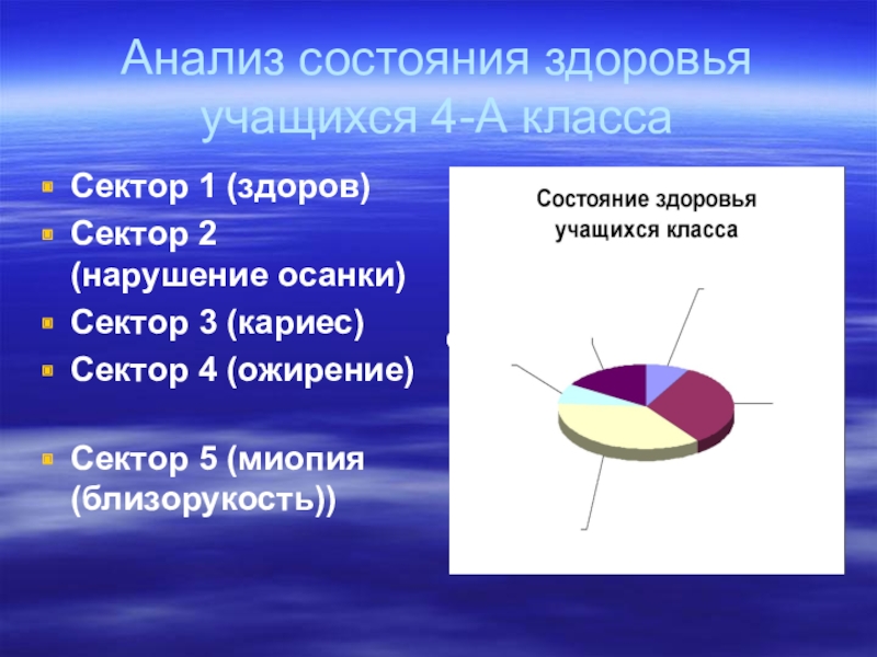 Анализ состояния здоровья учащихся 4-А классаСектор 1 (здоров)Сектор 2 (нарушение осанки)Сектор 3 (кариес)Сектор 4 (ожирение) 	Сектор 5