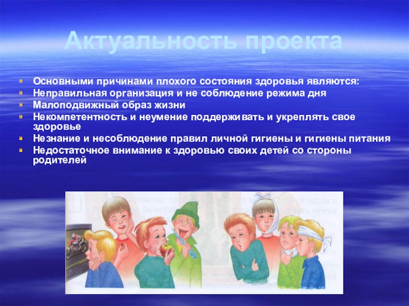 Актуальность проекта Основными причинами плохого состояния здоровья являются:Неправильная организация и не соблюдение режима дняМалоподвижный образ жизниНекомпетентность и