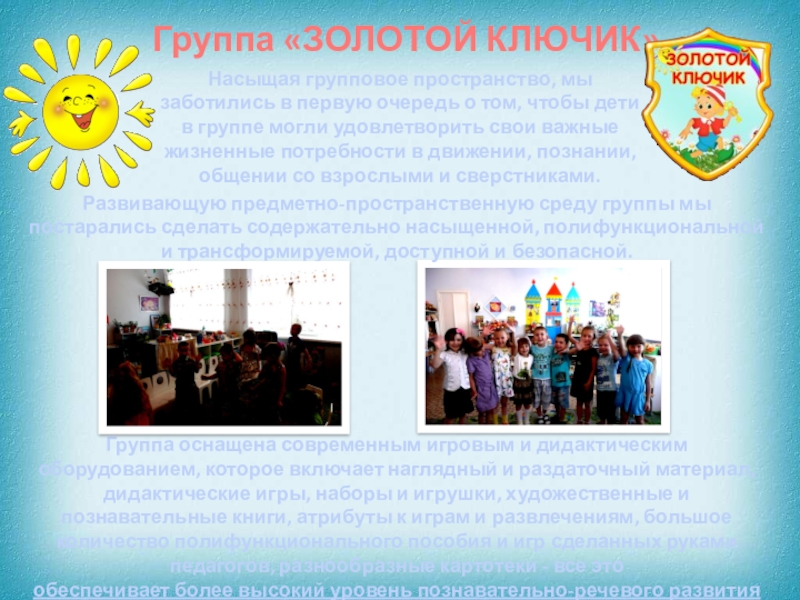 Группа оснащена современным игровым и дидактическим оборудованием, которое включает наглядный и раздаточный материал, дидактические игры, наборы и игрушки, художественные и познавательные книги, атрибуты к играм и развлечениям, большое количество полифункционального пособия и игр сделанных руками педагогов, разнообразные картотеки - все это