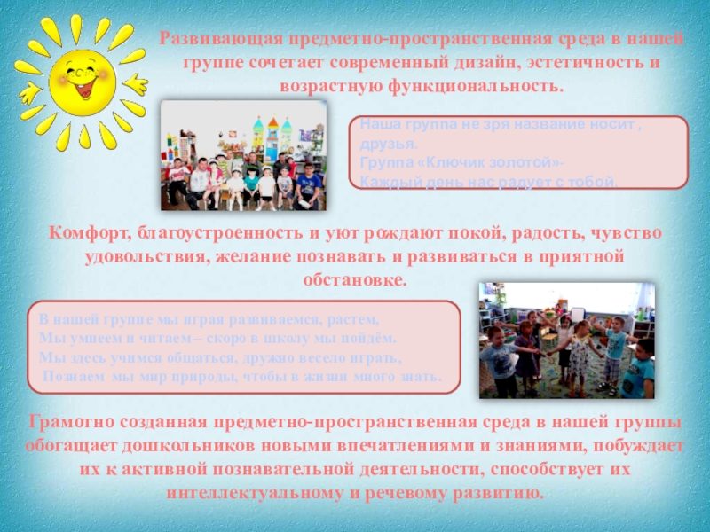 Комфорт, благоустроенность и уют рождают покой, радость, чувство удовольствия, желание познавать и развиваться в приятной обстановке.