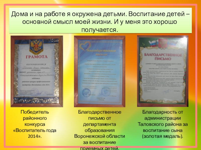Благодарственное письмо от департамента образования Воронежской области за воспитание приемных детей.