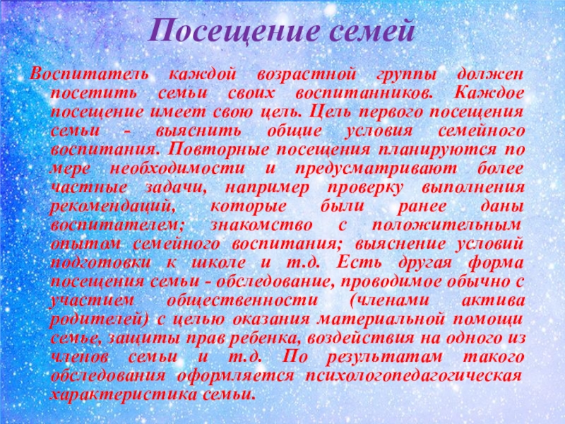 посещение имеет свою цель. Цель первого посещения семьи - выяснить общие условия семейного воспитания. Повторные посещения планируются по мере необходимости и предусматривают более частные задачи, например проверку выполнения рекомендаций, которые были ранее даны воспитателем; знакомство с положительным опытом семейного воспитания; выяснение условий подготовки к школе и т.д. Есть другая форма посещения семьи - обследование, проводимое обычно с участием общественности (членами актива родителей) с целью оказания материальной помощи семье, защиты прав ребенка, воздействия на одного из членов семьи и т.д. По результатам такого обследования оформляется психологопедагогическая характеристика семьи.