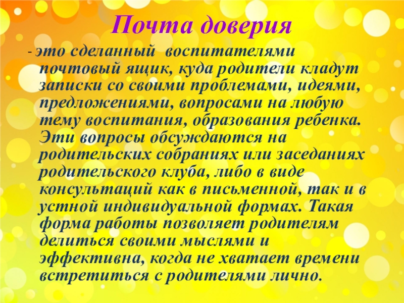 Почта доверия - это сделанный воспитателями почтовый ящик, куда родители кладут записки со своими проблемами, идеями, предложениями, вопросами
