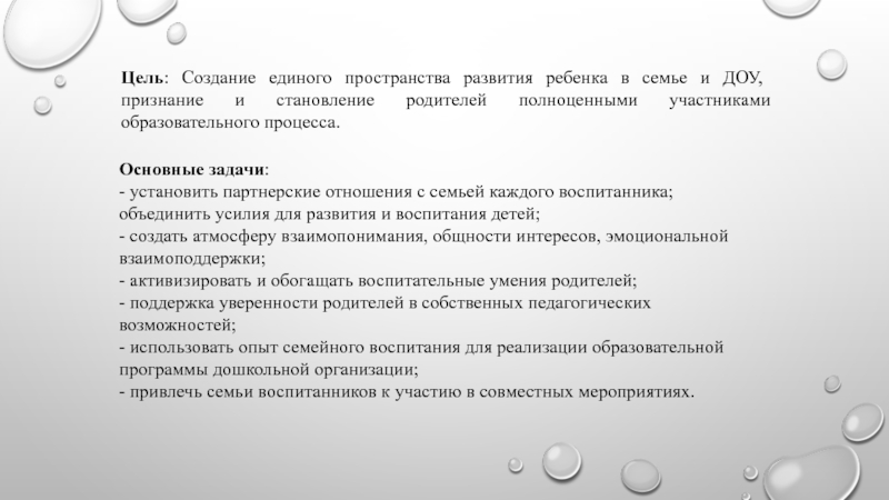 - установить партнерские отношения с семьей каждого воспитанника; объединить усилия для развития и воспитания детей;