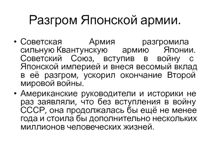 Советская Армия разгромила сильную Квантунскую армию Японии. Советский Союз, вступив