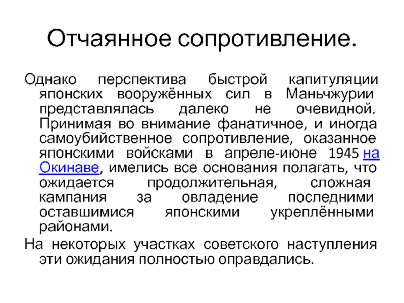 далеко не очевидной. Принимая во внимание фанатичное, и иногда самоубийственное сопротивление, оказанное японскими войсками в апреле-июне 1945 на Окинаве, имелись все основания полагать, что ожидается продолжительная, сложная кампания за овладение последними оставшимися японскими укреплёнными районами.