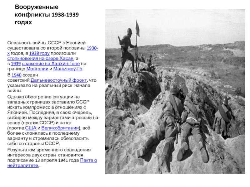 половины 1930-х годов, в 1938 году произошли столкновения на озере Хасан, а в 1939 сражение на Халхин-Голе на границе Монголии и Маньчжоу-Го.
