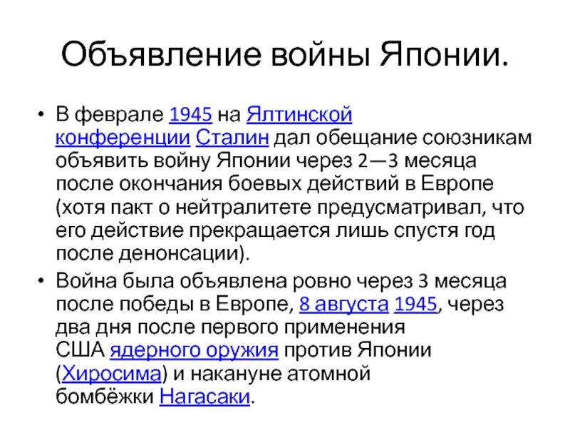 В феврале 1945 на Ялтинской конференции Сталин дал обещание союзникам объявить войну Японии через