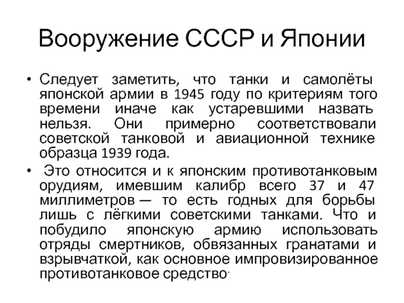 Это относится и к японским противотанковым орудиям, имевшим калибр всего 37 и 47 миллиметров — то есть годных для борьбы лишь с лёгкими советскими танками. Что и побудило японскую армию использовать отряды смертников, обвязанных гранатами и взрывчаткой, как основное импровизированное противотанковое средство.