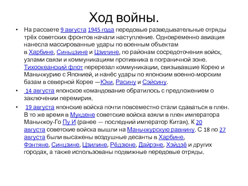 наступление. Одновременно авиация нанесла массированные удары по военным объектам в Харбине, Синьцзине и Цзилине, по районам сосредоточения войск, узлами связи и коммуникациям противника в пограничной зоне. Тихоокеанский флот перерезал коммуникации, связывавшие Корею и Маньчжурию с Японией, и нанёс удары по японским военно-морским базам в северной Корее —Юки, Расину и Сэйсину.