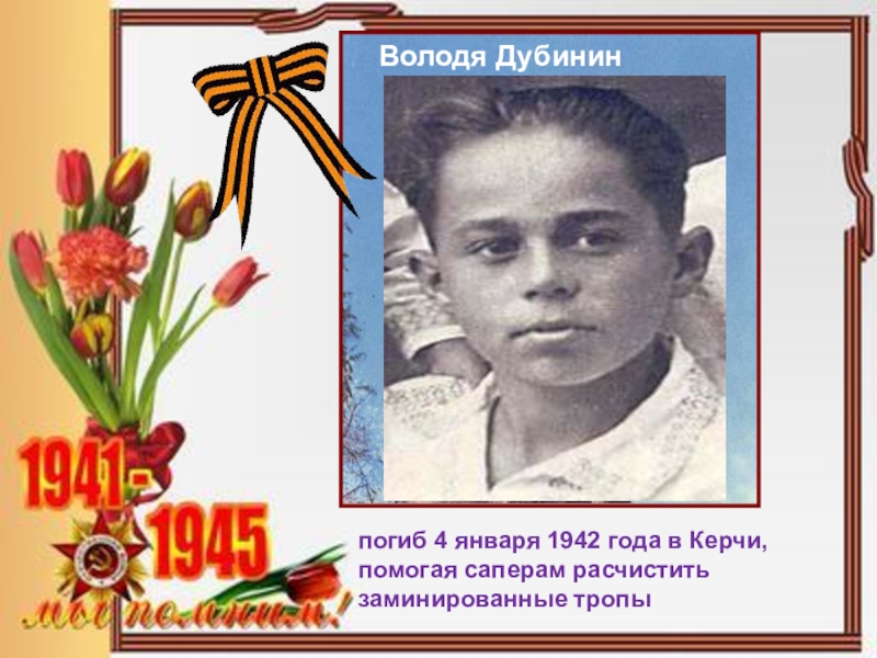 Слайд 43погиб 4 января 1942 года в Керчи, помогая саперам расчистить заминированные