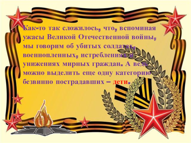 об убитых солдатах, военнопленных, истреблениях и унижениях мирных граждан. А ведь можно выделить еще одну категорию безвинно пострадавших – дети.